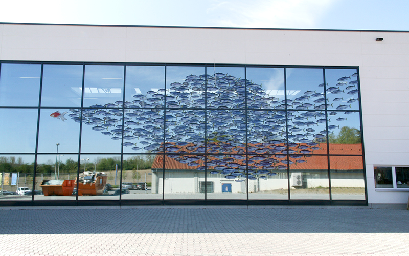 Das neue Firmengebäude der Firma Glas Teich in Mühlhausen schmückt ein Schwarm Fische. Der beeindruckende Entwurf stammt aus der Feder unserer Grafikabteilung und dank unserer Druckqualität bestechen die einzelnen Glasscheiben durch Farbbrillanz und Farbbeständigkeit.