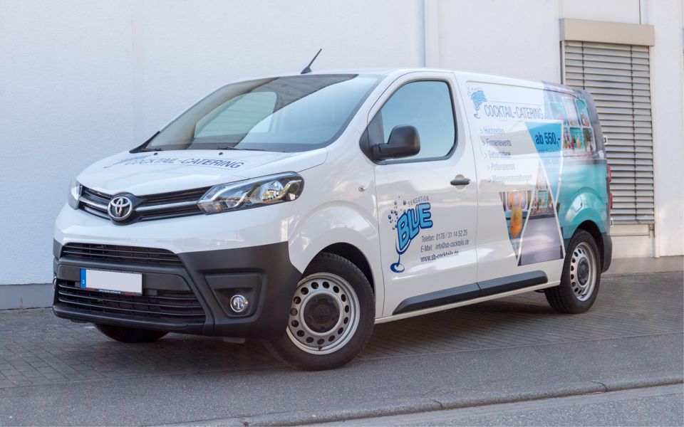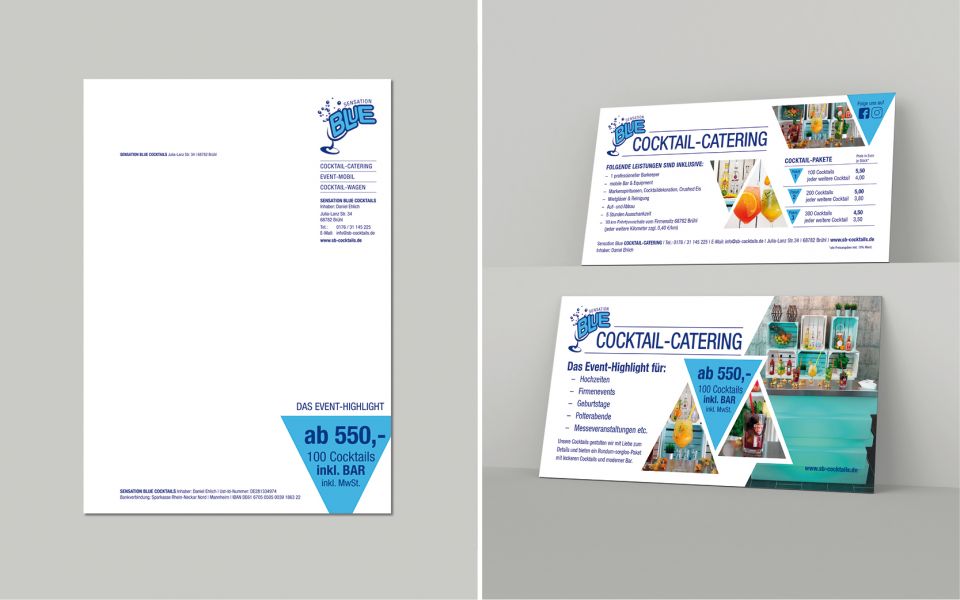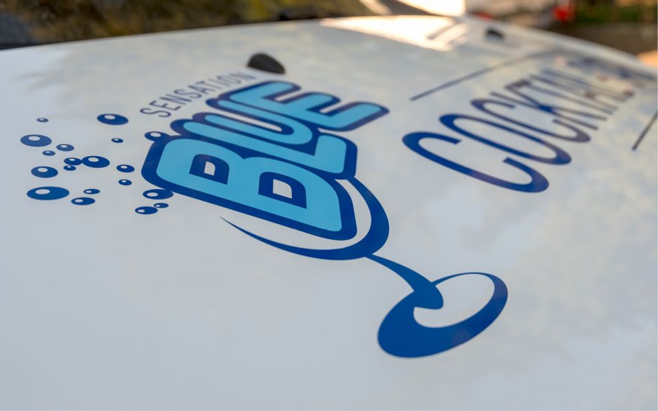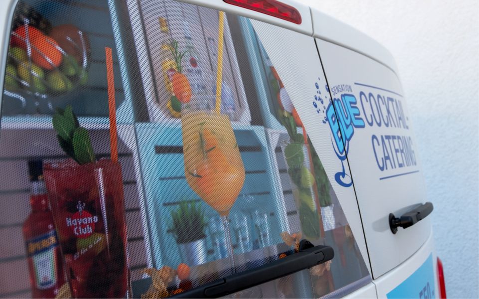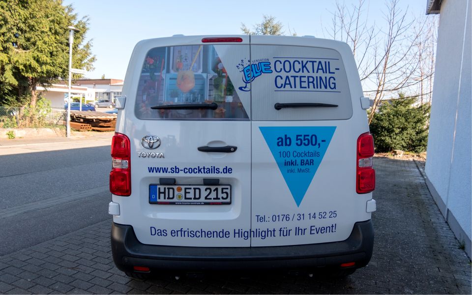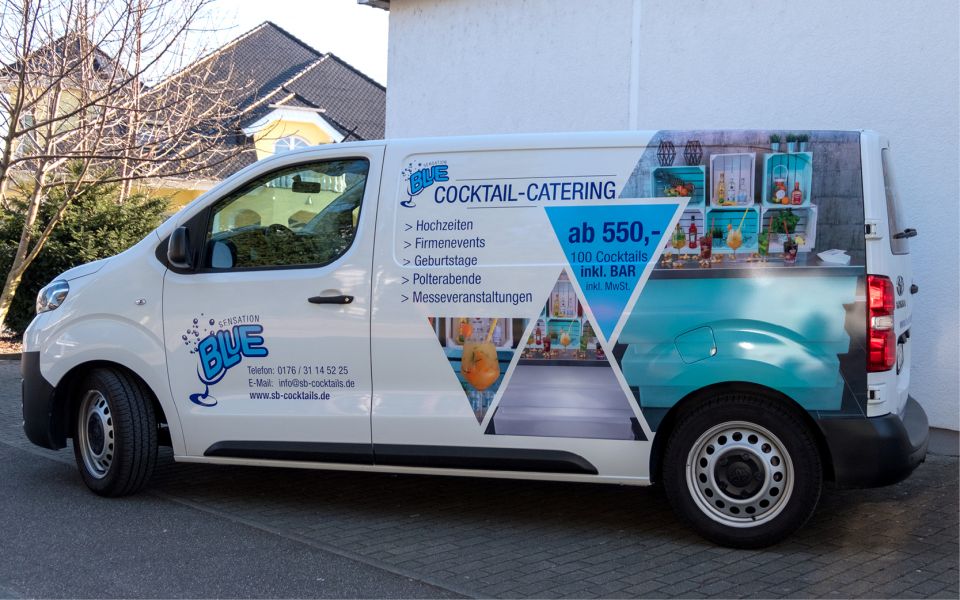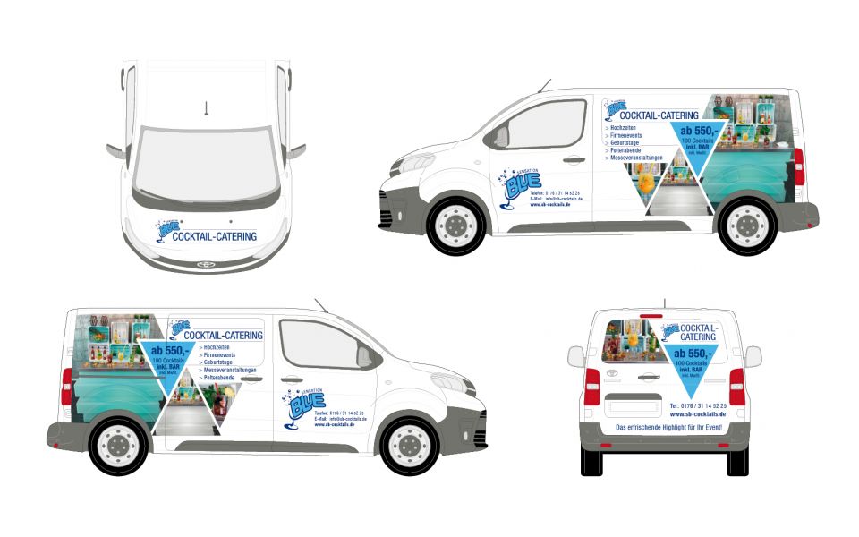 Nach der erfolgreichen Konzeptionierung und Realisierung des neuen Cocktail/Wein-Anhängers unseres Kunden folgte jetzt der Wunsch nach einem neuen Konzept für einen weiteren Unternehmensbereich der Firma Sensation Blue. Es entstand daraufhin ein komplett neues Corporate Design für das Cocktail-Catering. Das Ergebnis war ein optimal aufeinander abgestimmtes Konzept mit neuem Bildmaterial - angefangen vom Briefpapier über Flyer und Werbebanner bis zur passenden Fahrzeugbeklebung.